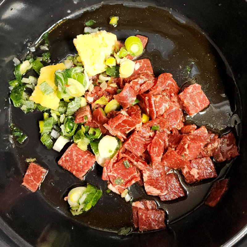 5) 핏물 제거한 소고기 100 g 네모 썰기 해요.