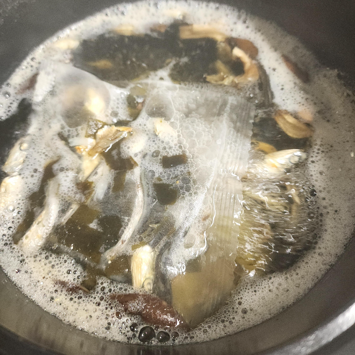 1) 중불로 냄비에 육수팩 1 개, 마른 멸치 5 개,